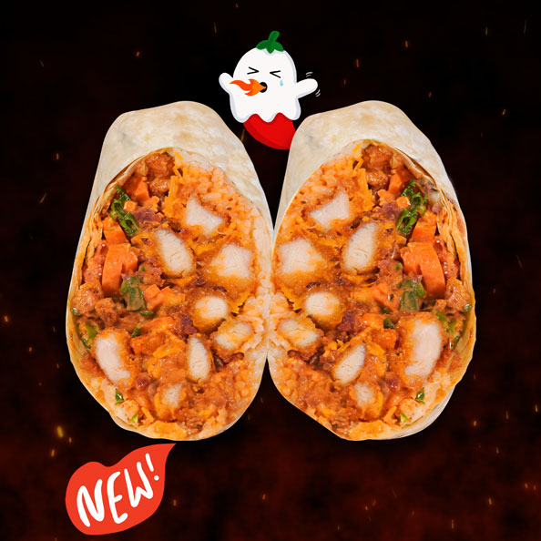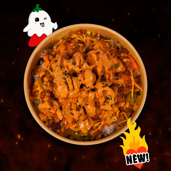 White rice, chicken tempura, melted cheese, bacon, pickled jalapeños, scallions, pickled carrots, fried onions, NEW Ghostfire sauce.