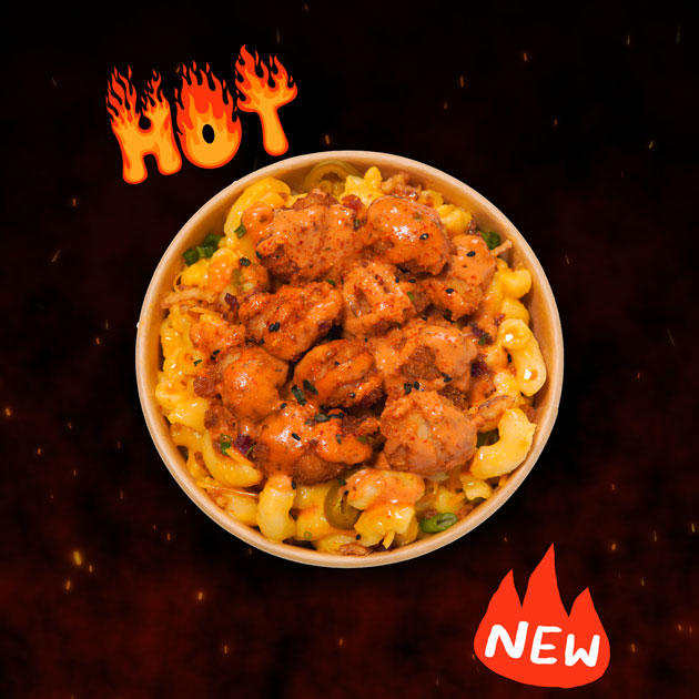 Mac & cheese, chicken tempura, melted cheese, bacon, pickled jalapeños, scallions, fried onions, chili powder, sweet soy, NEW Ghostfire sauce.