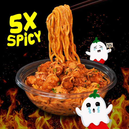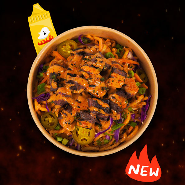 5X SPICIER than the regular Ghostfire sauce! Eat at your own risk! Chilled Japanese soba noodles dressed in Extreme Ghostfire sauce, chicken tempura, scallions, nori seasoning, Extreme Ghostfire sauce drizzled on top.