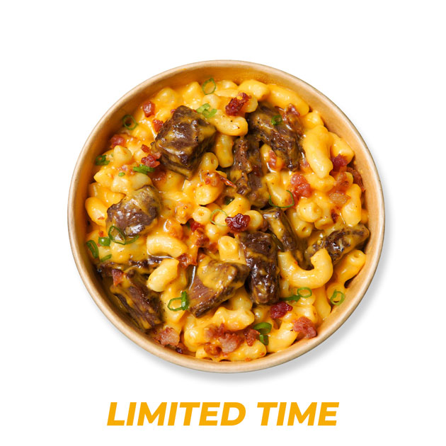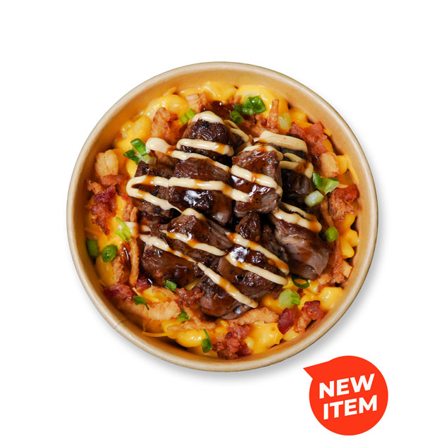 Mac & cheese, grilled steak, cheese, bacon, scallions, fried onions, white sauce, sweet teriyaki.