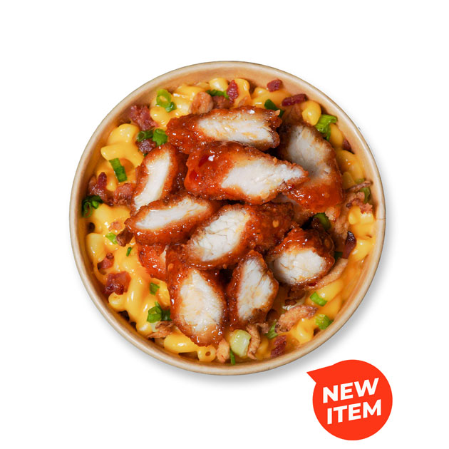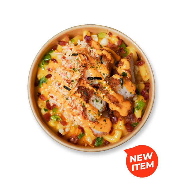 Mac & cheese, spicy krab, chicken tempura, cheese, bacon, scallions, nori seasoning, tempura flakes, fire sauce, sweet soy.