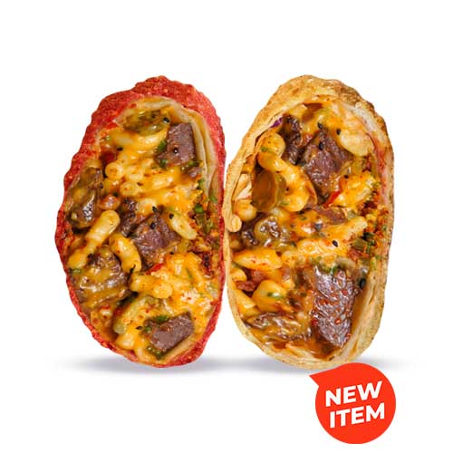 Fried burrito with grilled steak tempura, mac & cheese, melted cheese, bacon, sweet soy sauce, and fried in your choice of Flamin’ Hot® Cheetos® or Panko Fried.
